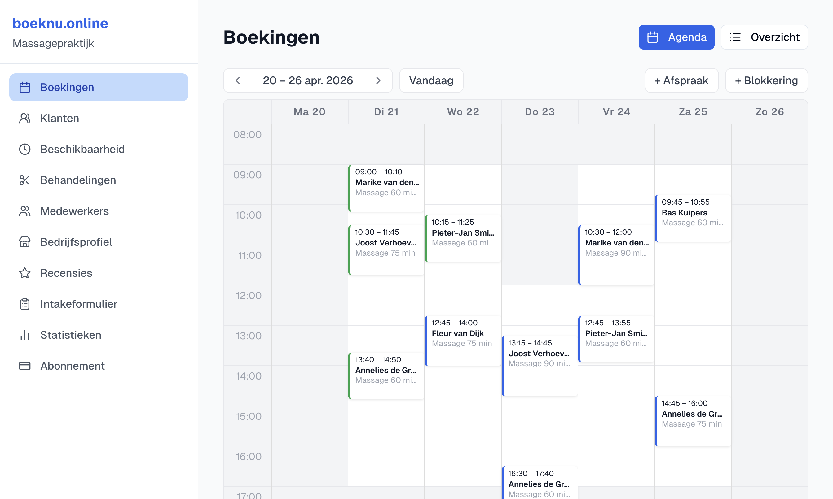 “Het dashboard is overzichtelijk en mijn klanten vinden de boekingspagina erg professioneel. De herinneringsmails zorgen voor minder no-shows.”